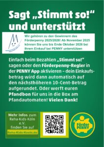 „Vielen Dank an alle, die uns für Hürth mit ihrer Stimme beim Voting zum Gewinner des „Förderpenny“ 2025/2026 gemacht haben. Als Förderpenny-Gewinner bekommen wir ein ganzes Jahr lang alle Beträge, die durch ein „Stimmt so!“ an der Kasse oder durch eine Pfandbonspende in den Hürther Penny-Märkten zusammenkommen. Also: Sagen Sie jetzt bei PENNY an der Kasse „Stimmt so!“ oder aktiviert den Förderpenny-Regler in der PENNY App und runden damit Ihren Einkauf auf den nächsthöheren 10-Cent-Betrag für uns auf. Oder werfen Sie ganz einfach Ihren Pfandbon in die Box am jeweiligen Pfandautomaten!“ bedankt sich der Reha-Kids Vorsitzende, Prof. Dr. Eckhard Schönau, und ruft zu Spenden bei Penny in Hürth auf.